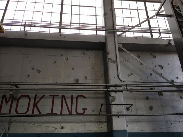 Hangar 11 when I worked there. Bullet marks from the strafing. I played basketball on a court there at work, beneath a B-18 hoist and instructions.