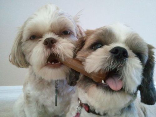 Two Shi-tzu sharing their Christmas cookie.