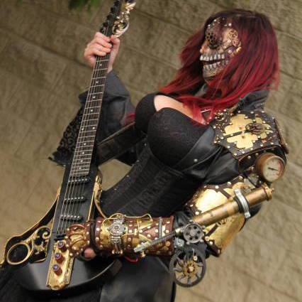 Zombie Droid Minstrel – Photographer: Sergio Mazzotta – https://www.facebook.com/sergio.mazzotta?fref=ts Model and mask: Karianne Gottschalk Guitar: Steampunk Fabricators Arm Piece: Thomas Wileford, Brute Force Leather