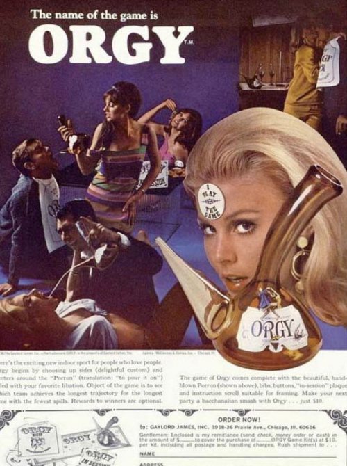 Orgy – the game. As far as I see the rules, you mix partners, get them drunk, then the fun begins. Not sure why you buy the game…