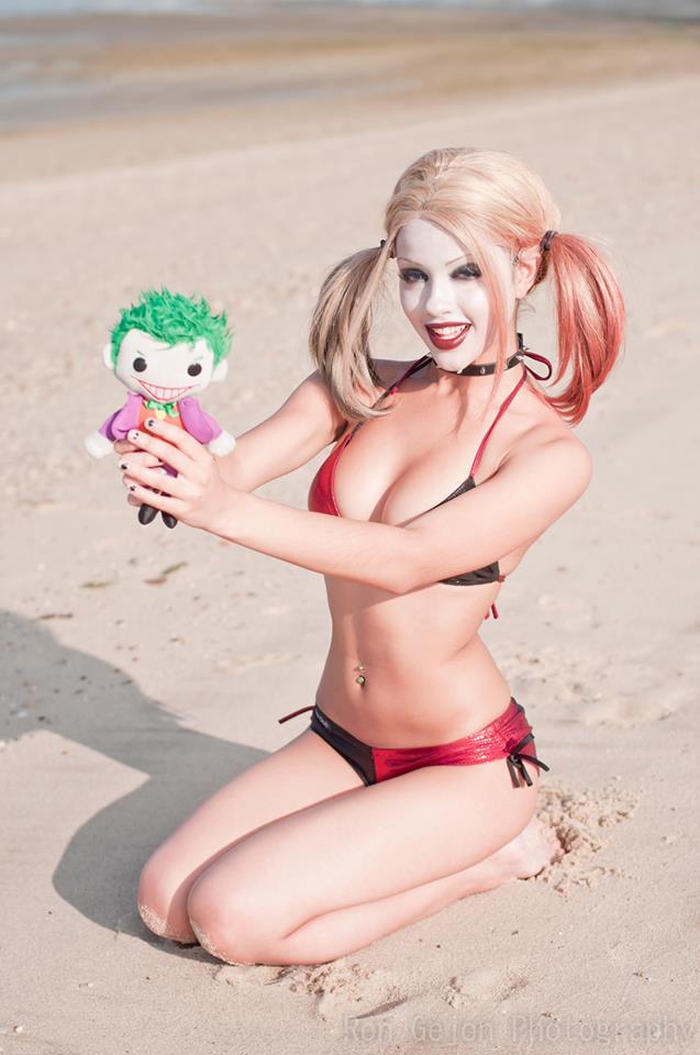 Harley Quinn with boyfriend Joker doll at the beach (Kitty Young Cosplay)