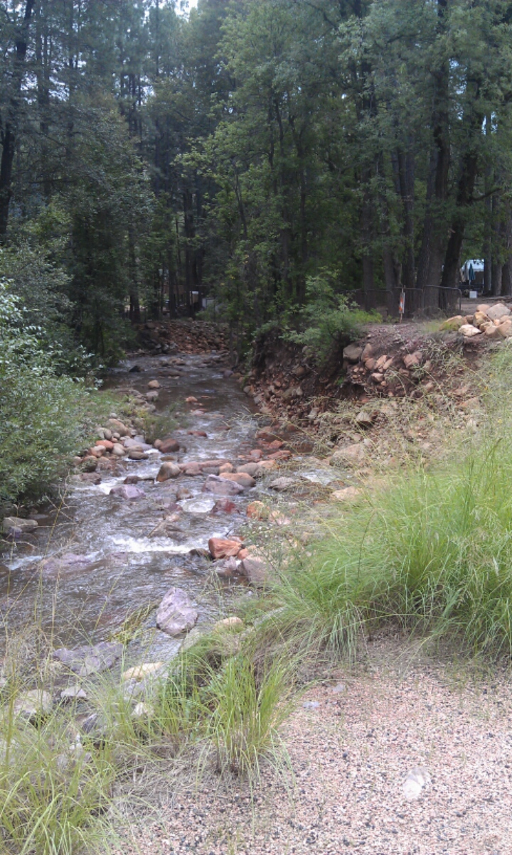 I had scheduled posts while I was gone, but I was out of town from Sunday through Wednesday up at Christopher Creek in Arizona in the tall pines beside the eponymous stream. We stayed once more at Christopher Creek Lodge. The last time we went, we were snowed in with a freak storm. This time, we were rained on by a freak rain storm. I told them that if they ever need moisture, invite us to come up and stay. Our house here in North Phoenix received 2.64 inches of rain the first day we were gone and the freeway was shut down due to flooding. So, it was probably worse rain if we had stayed home.
